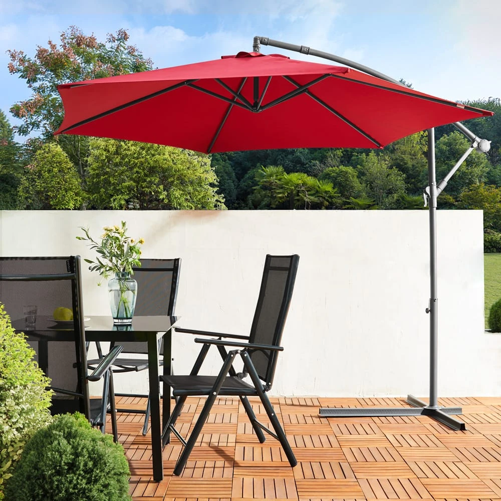 Die Bespannung bietet Ihnen einen sicheren UV-Schutz 50+ und ist zudem wasserabweisend. Der Schirm steht stabil auf einem Fußkreuz (zur Befestigung mit handelsüblichen Betonplatten) und kann überall platzsparend positioniert werden.