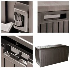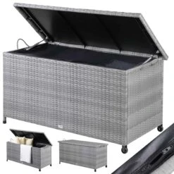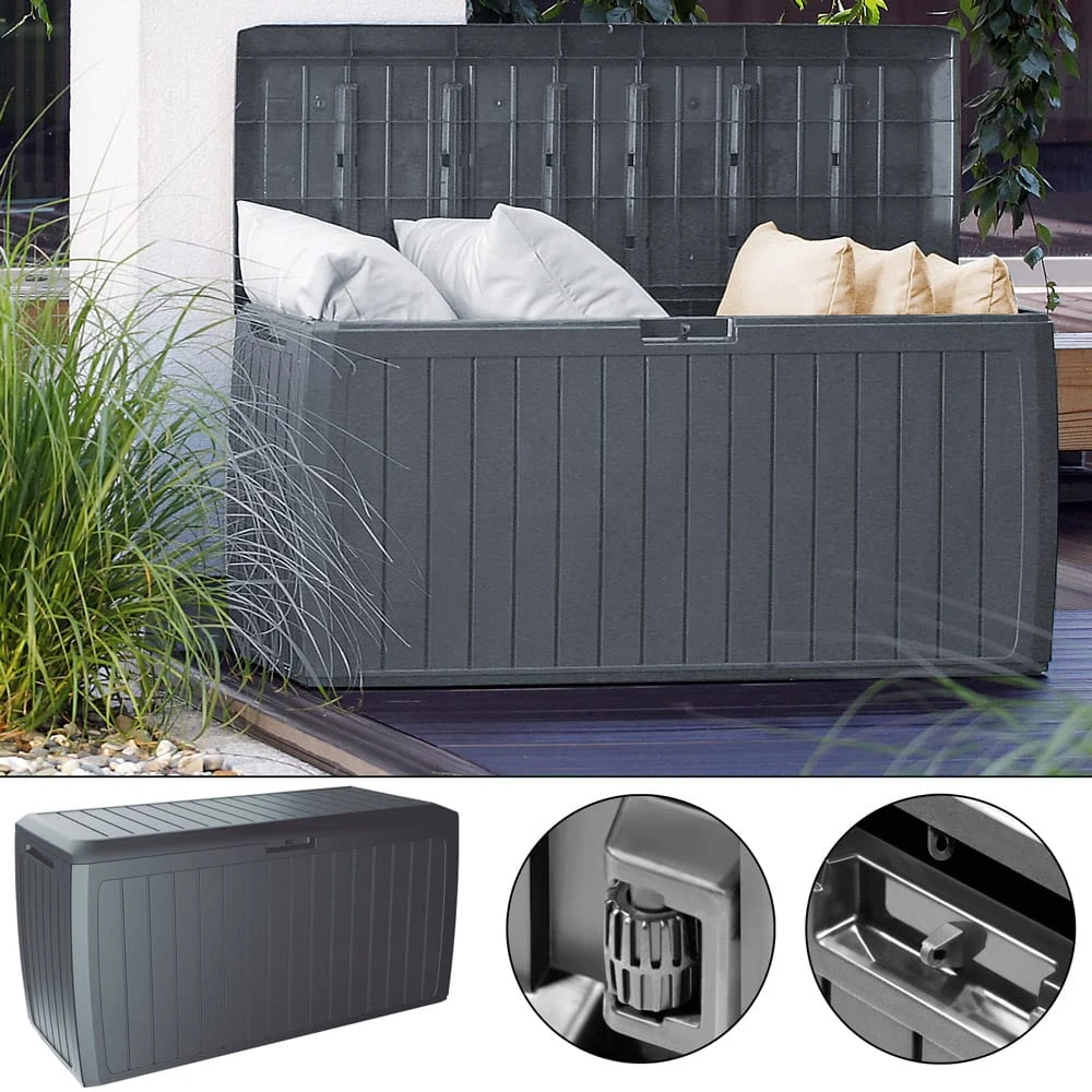 Die wetter- und UV-beständige Auflagenbox mit einem Volumen von 290 Litern bietet ausreichend Platz. Sie besitzt 6 Rollen zum einfachen Bewegen, eine Verschlussvorrichtung am Deckel und seitliche Tragegriffe.