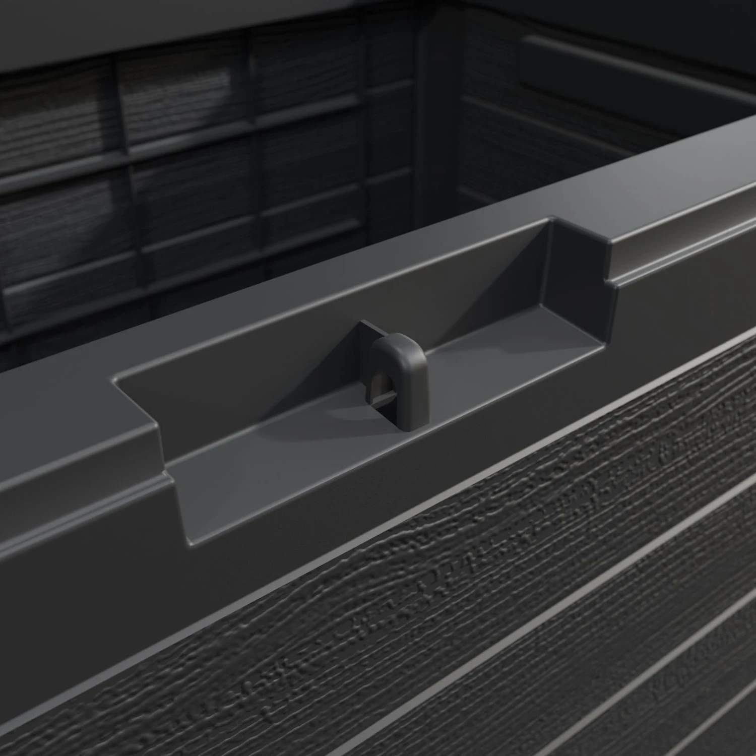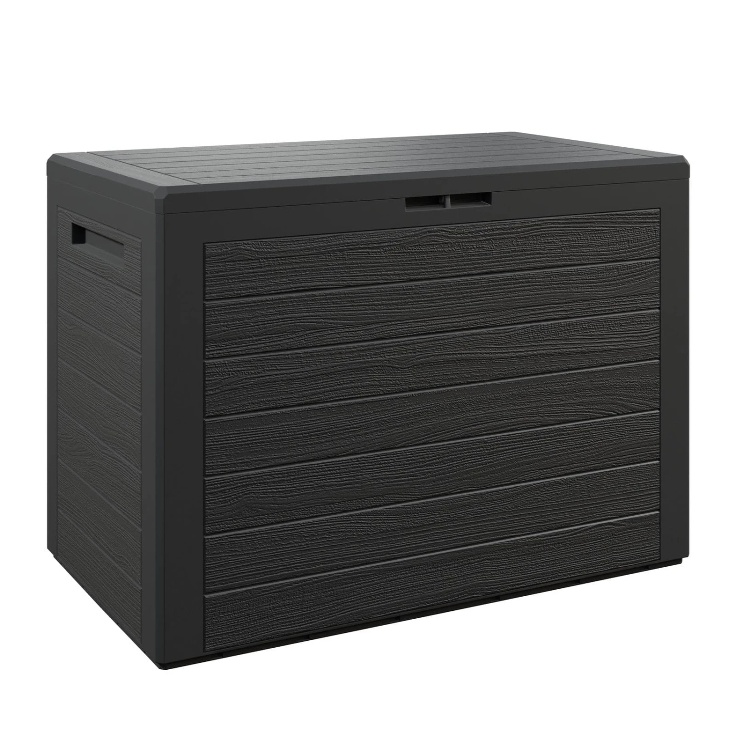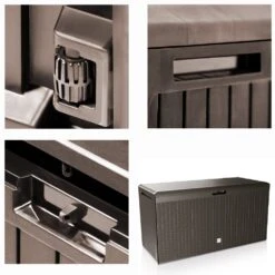Die Auflagenbox aus Kunststoff in Holzoptik bietet Platz für Sitzauflagen, Kissen und andere Gartenaccessoires. Der Klappdeckel mit Abschließvorrichtung kann mit einem handelsüblichen Vorhängeschloss (nicht im Lieferumfang enthalten) verschlossen werden. Die Box ist außerdem mit seitlichen Griffmulden ausgestattet.