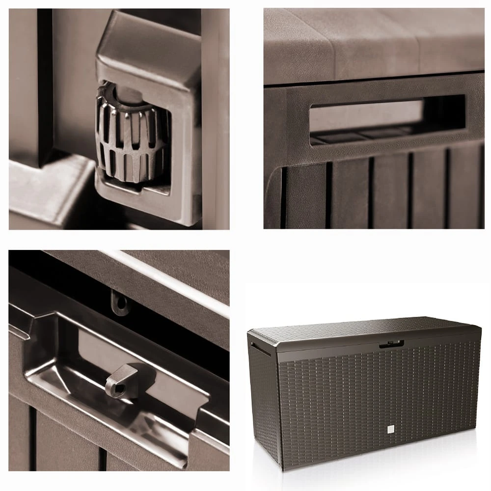 Die wetter- und UV-beständige Auflagenbox mit einem Volumen von 290 Litern bietet ausreichend Platz. Sie besitzt 6 Rollen zum einfachen Bewegen, eine Verschlussvorrichtung am Deckel und seitliche Tragegriffe.