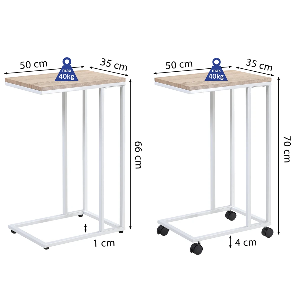 Der Beistelltisch verfügt über 4 abnehmbare Standfüße. Die Füße können im Handumdrehen zu vier leichtgängigen Rollen gewechselt werden. Der Tisch lässt sich so kinderleicht verschieben. Um ein Verrutschen am Bett oder der Couch zu verhindern haben 2 der 4 Rollen Bremsen.