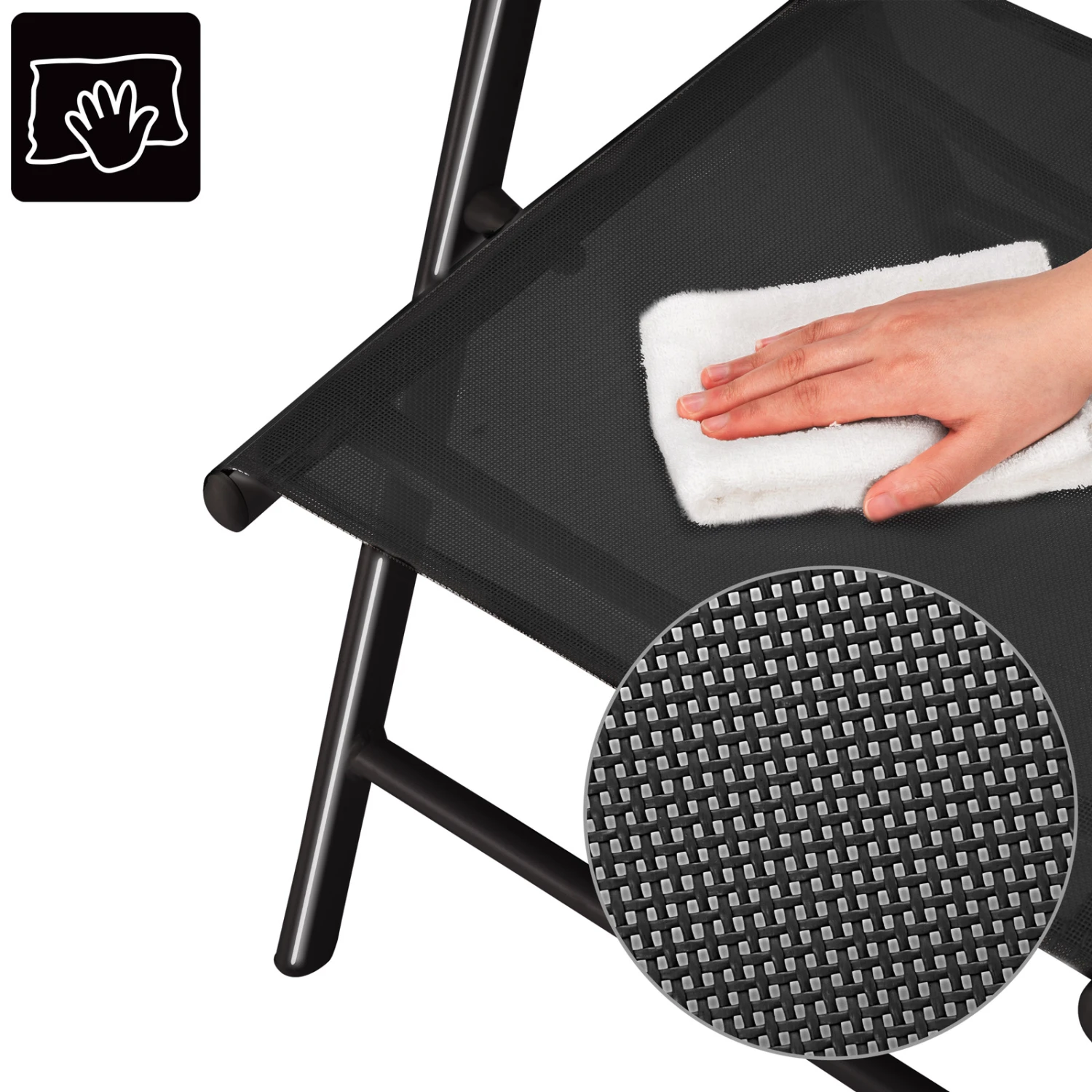 Die Bezüge der Stühle sind aus wetterfestem, strapazierfähigem, pflegeleichtem und abwaschbarem Textilen-Kunststoffgewebe.