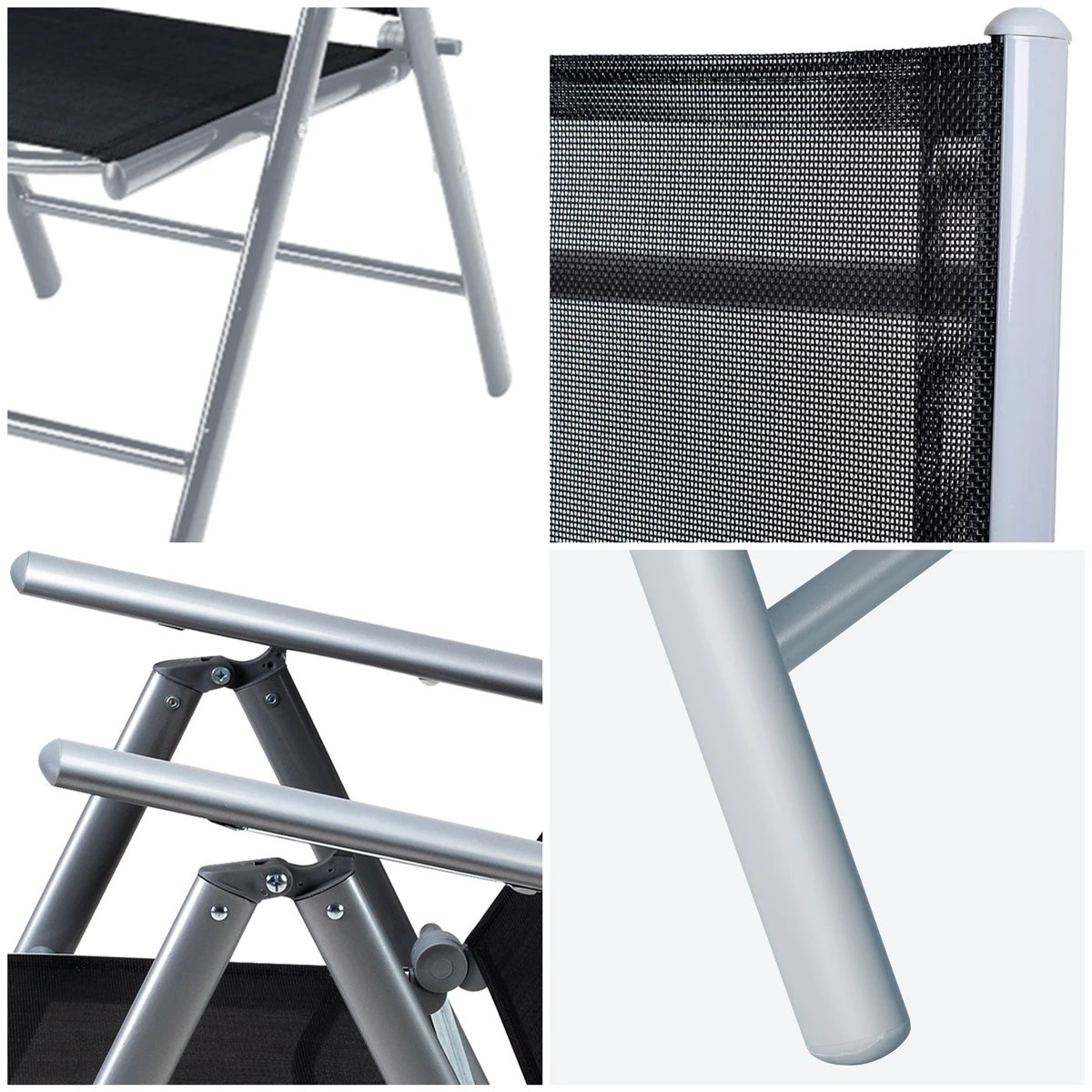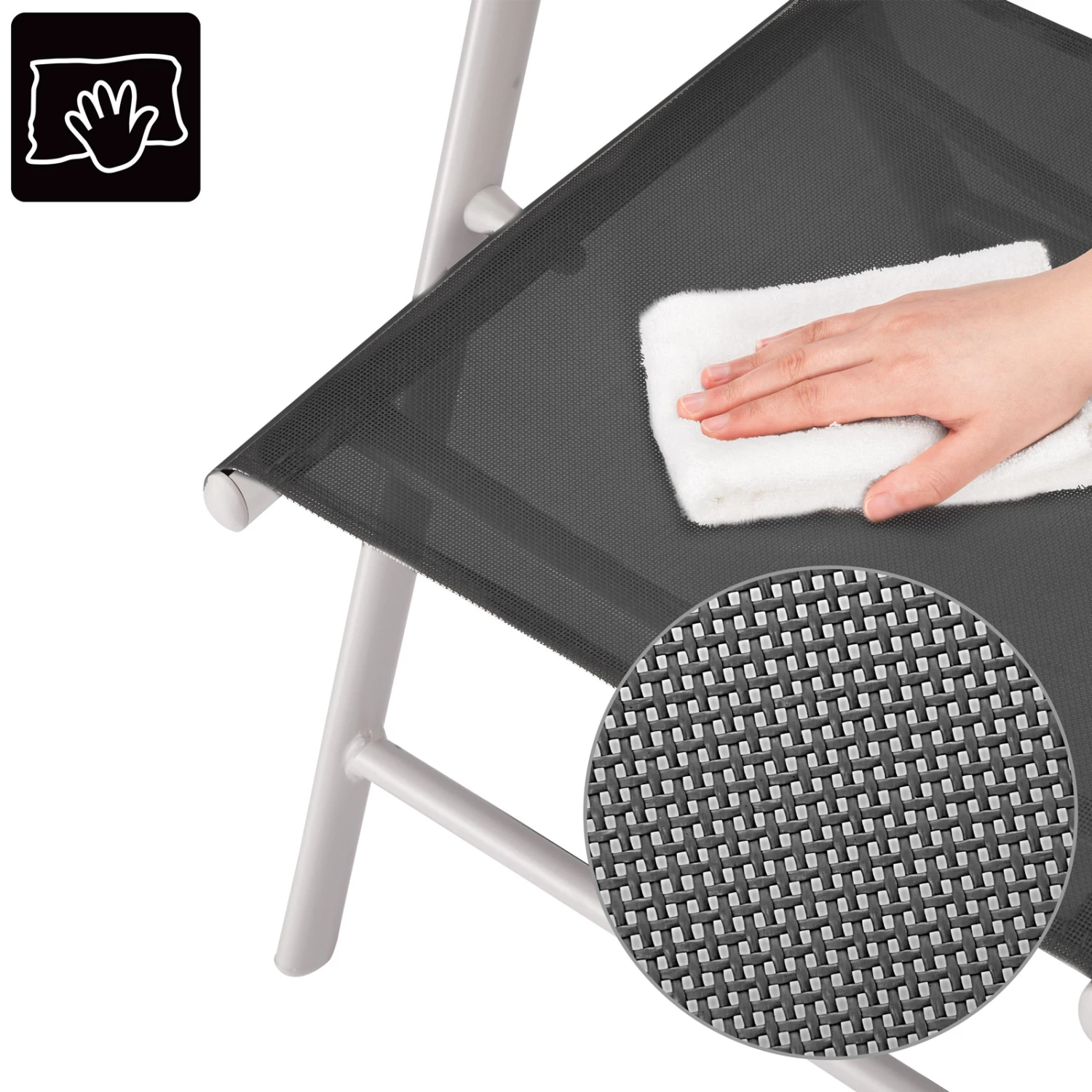 Die Bezüge der Stühle sind aus wetterfestem, strapazierfähigem, pflegeleichtem und abwaschbarem Textilen-Kunststoffgewebe.