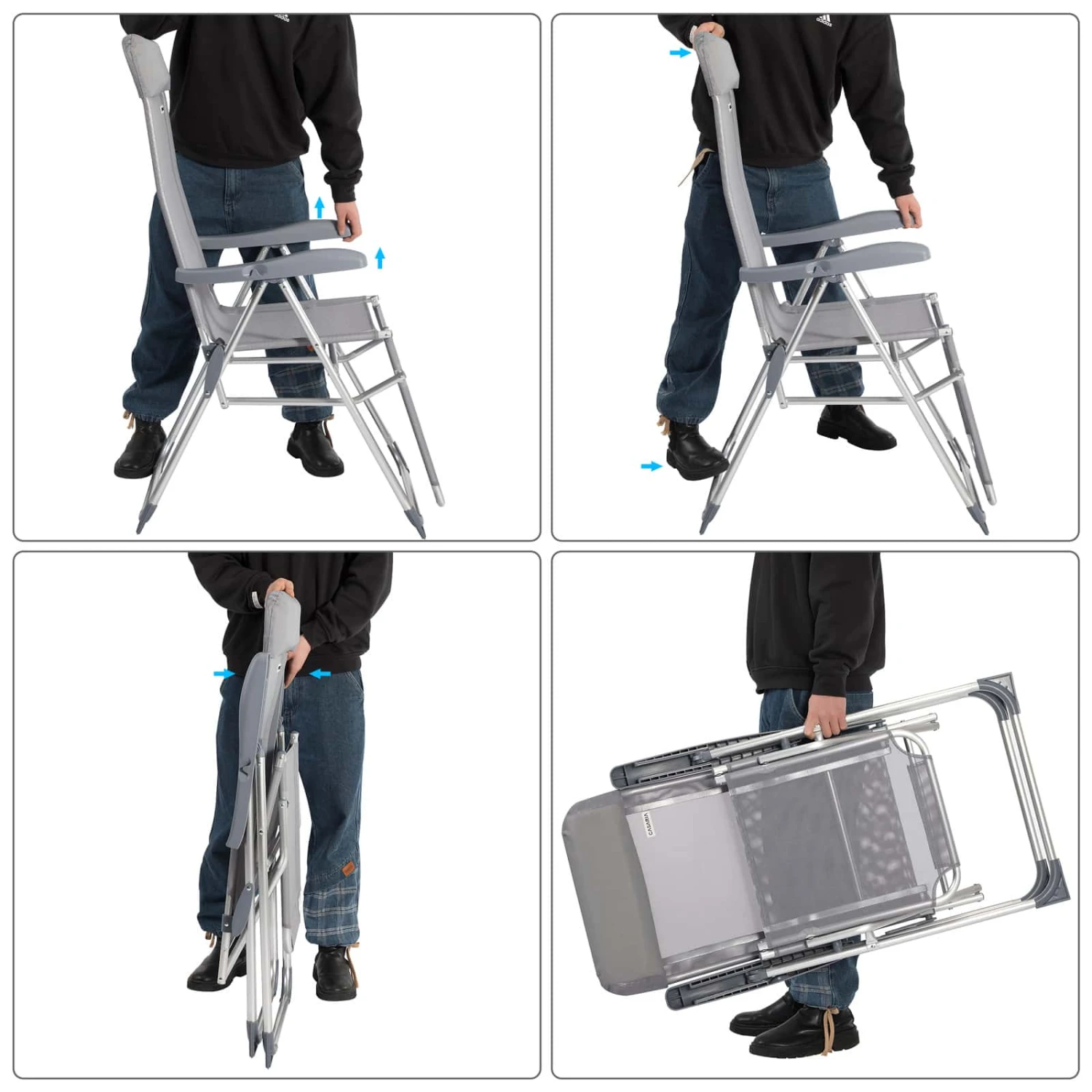 Die Hochlehner sind 5-fach verstellbar und bestehen aus einem hochwertigen Aluminiumrahmen. Der Kopfbereich ist mit einem bequemen Polster ausgestattet.