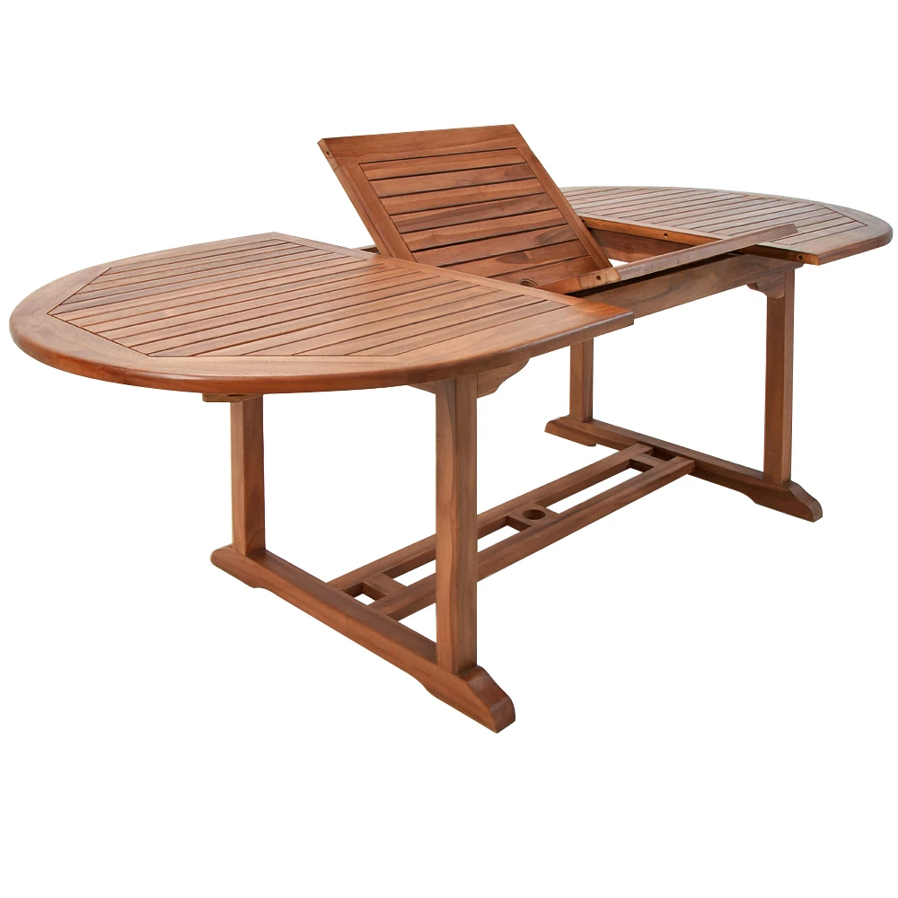 Der Tisch ist aus witterungsbeständigem Eukalyptusholz hergestellt.
