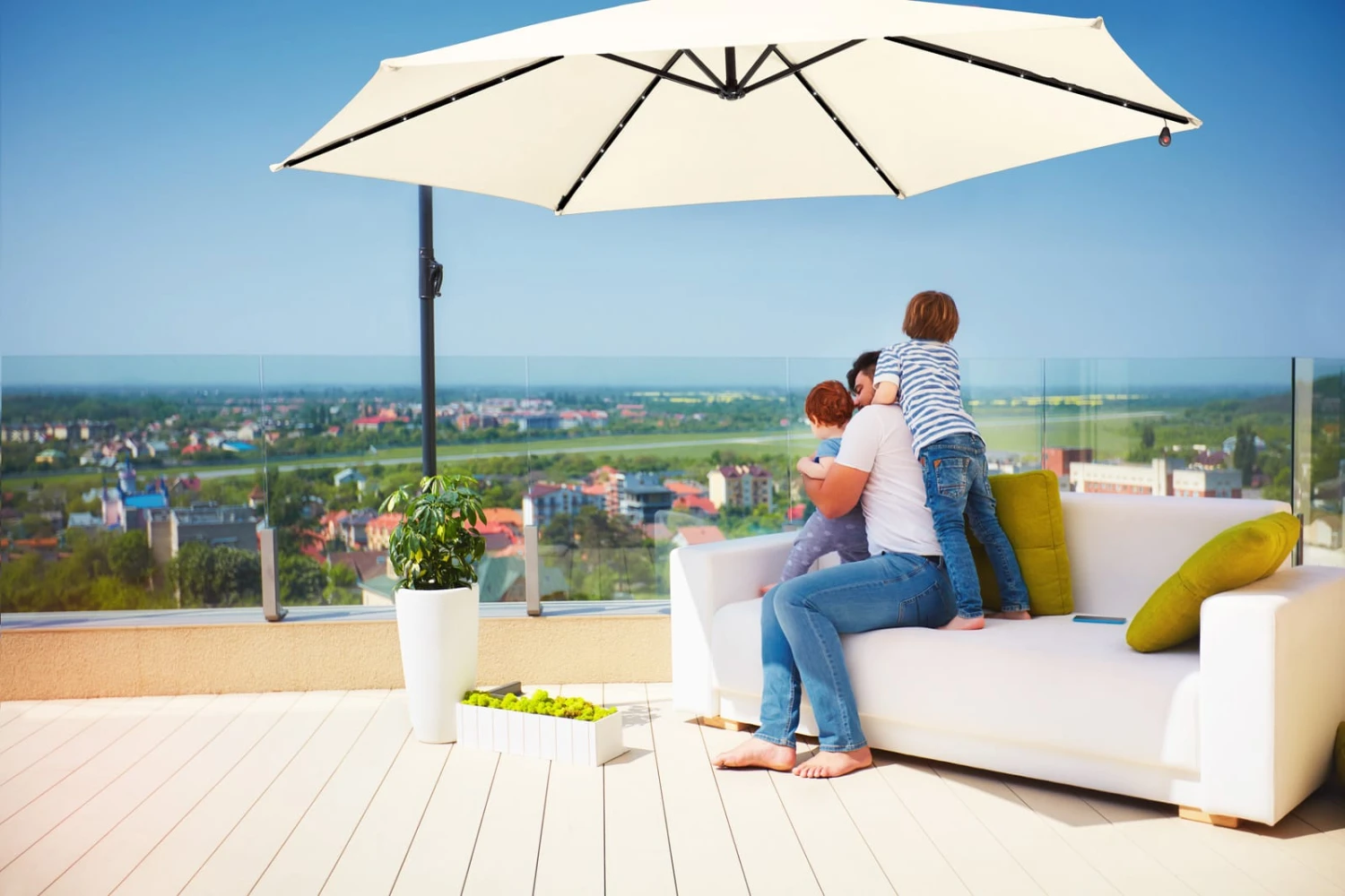 Um die Standsicherheit des Sonnenschirms zu gewährleisten, müssen Sie das Fußkreuz rundum mit Gewichten beschweren.