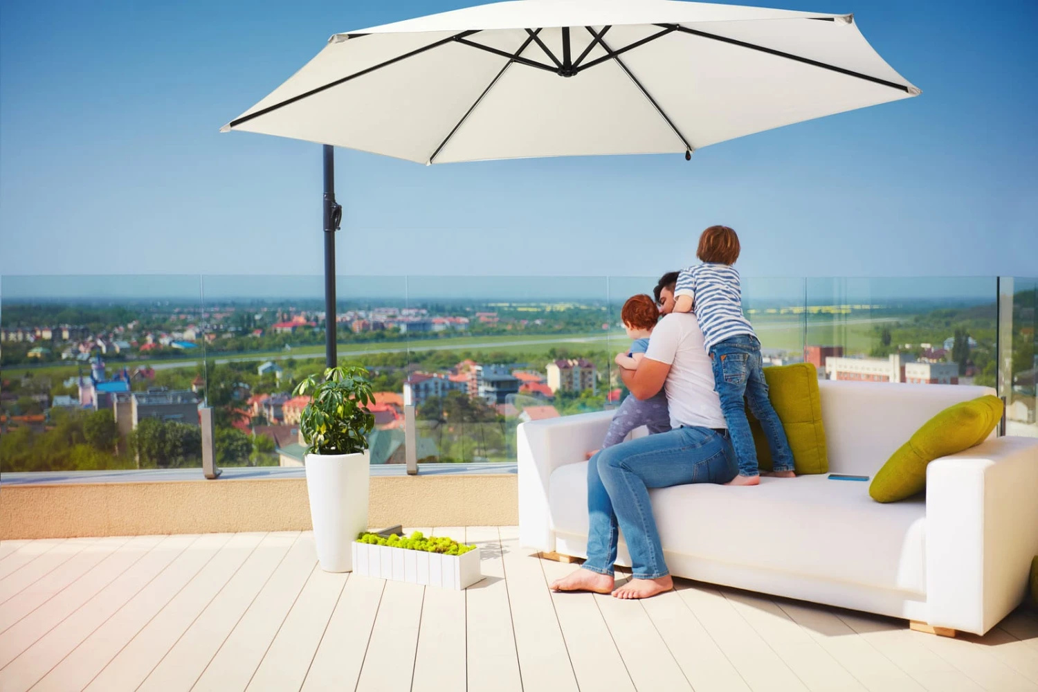 Genießen Sie tagsüber den angenehmen Schatten den der große Terrassenschirm spendet und entspannen Sie sich an warmen Sommertagen im Garten, auf der Terrasse oder dem Balkon.