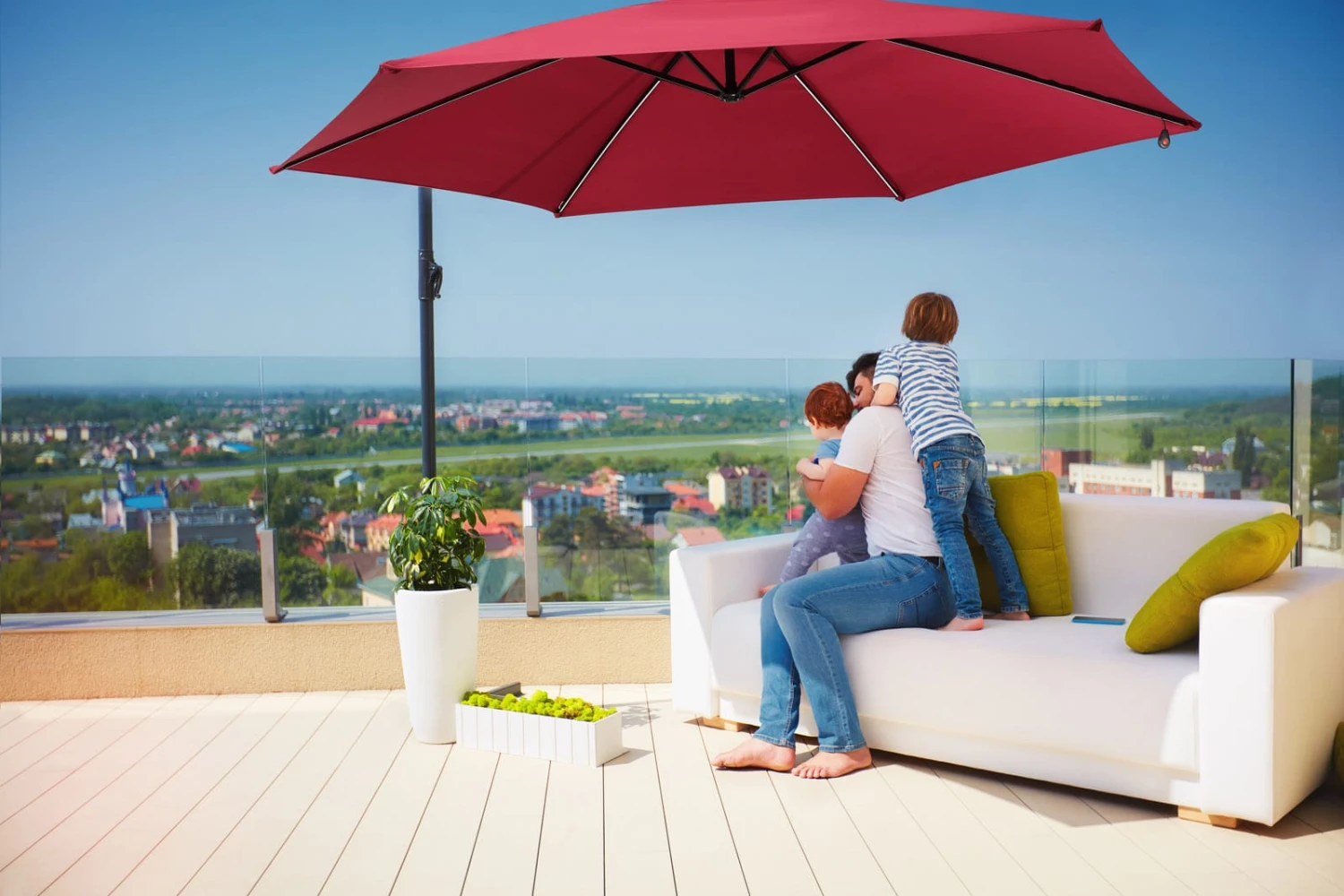 Genießen Sie tagsüber den angenehmen Schatten den der große Terrassenschirm spendet und entspannen Sie sich an warmen Sommertagen im Garten, auf der Terrasse oder dem Balkon.