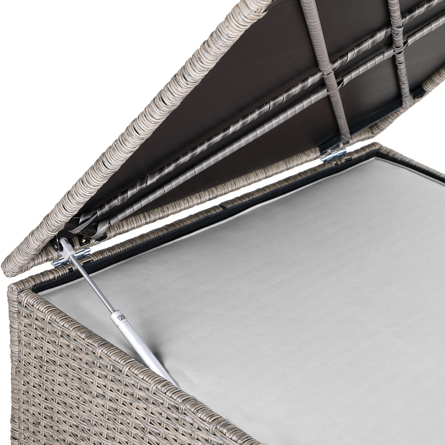 Die robuste Auflagenboxen bietet mit 318 L Fassungsvermögen viel Stauraum für Sitzauflagen, Kissen und andere Gartenaccessoires. Das wetterfeste Polyrattan und das galvanisierte Stahlgestell sind bestens für den Outdoor-Einsatz geeignet. Die Oberfläche der Gartenbox ist schmutzabweisend und einfach zu reinigen.