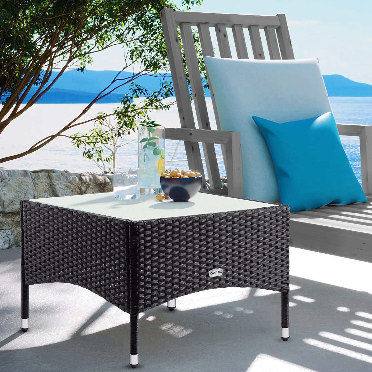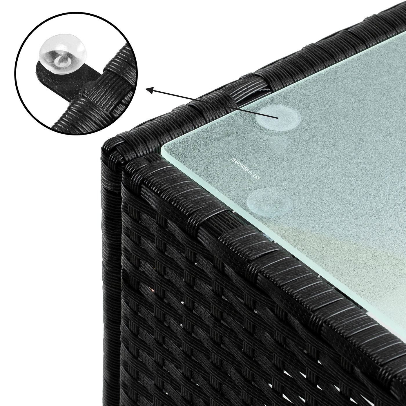 Der ansprechende Polyrattan Beistelltisch verleiht Ihrem Wohnambiente ein ganz besonderes Flair. Ausgestattet mit einer hochwertigen Glasplatte bietet der Tisch reichlich Platz und ist leicht zu reinigen. Der Tisch ist aus UV-lichtbeständigem Polyrattan – an diesem Tisch werden Sie lange Freude haben.