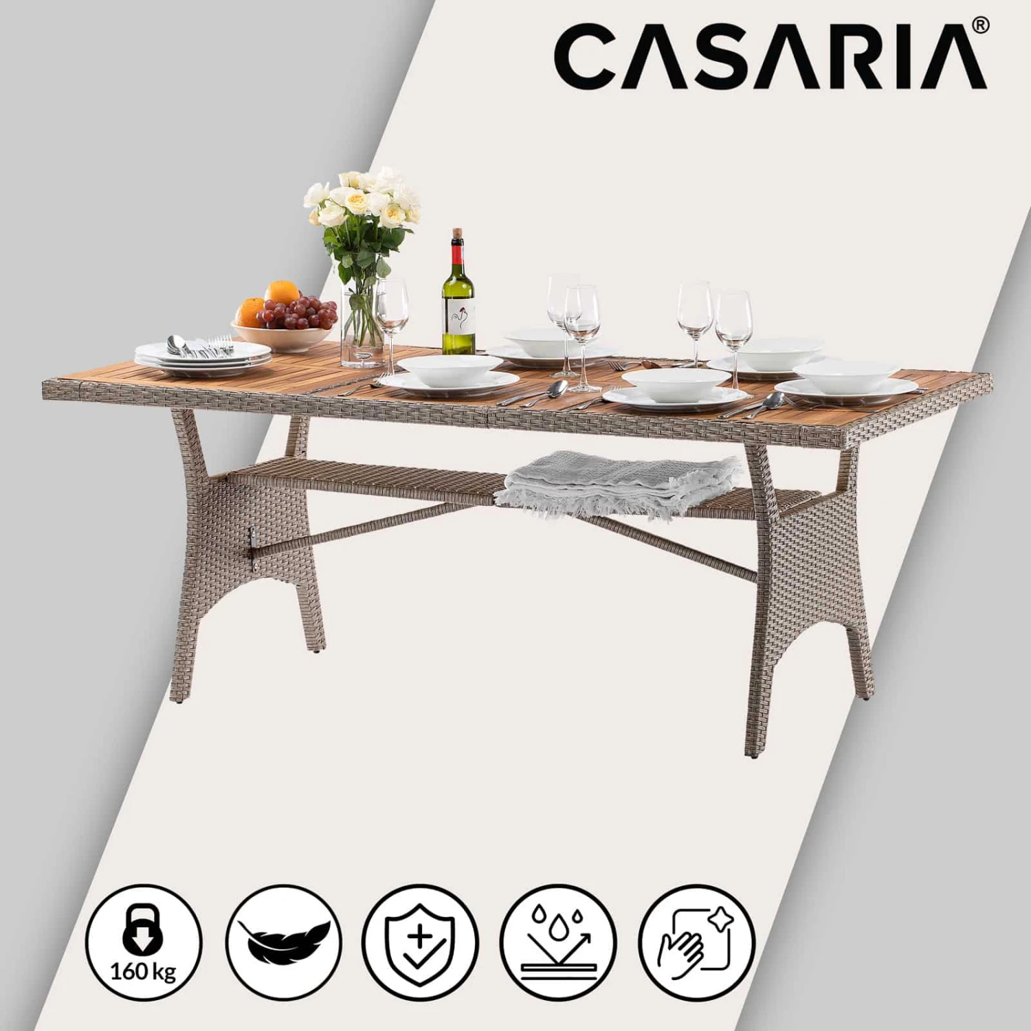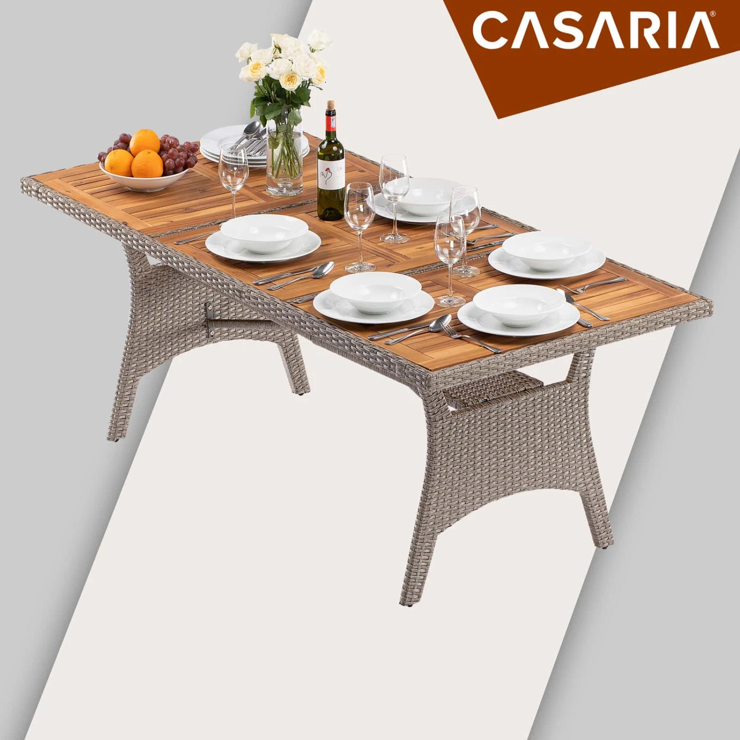 Der Gartentisch von Casaria® für bis zu 8 Personen ist die ideale Ergänzung für Ihr Garten, Terrasse oder Wintergarten. Die Tischplatten aus geöltem Akazienholz und die natürliche, elegante Holzmaserung ist das Highlight bei jeder Gartenparty. Das Polyrattan ist wetterfest, UV-lichtbeständig, schmutzabweisend und leicht zu reinigen.