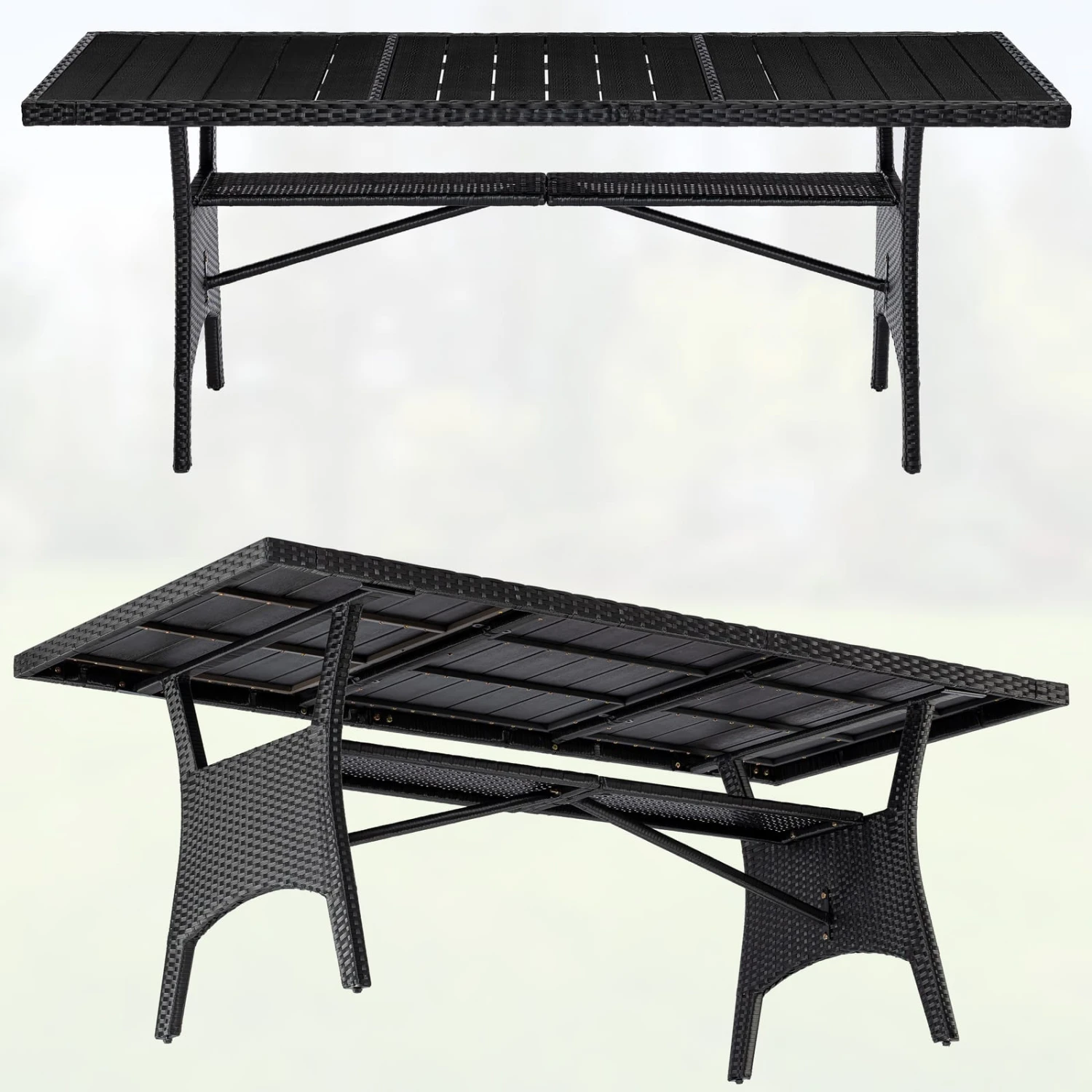 - Material Tischplatte: WPC (Holz/Kunststoffkombination)
