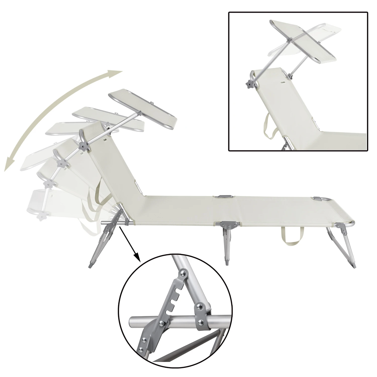 Das Sonnendach ist stufenlos verstellbar und die robusten Aluminiumgelenke sorgen für einen guten Stand. Die Bespannung der Liege ist mit 600D Polyester wetterfest und UV-beständig.