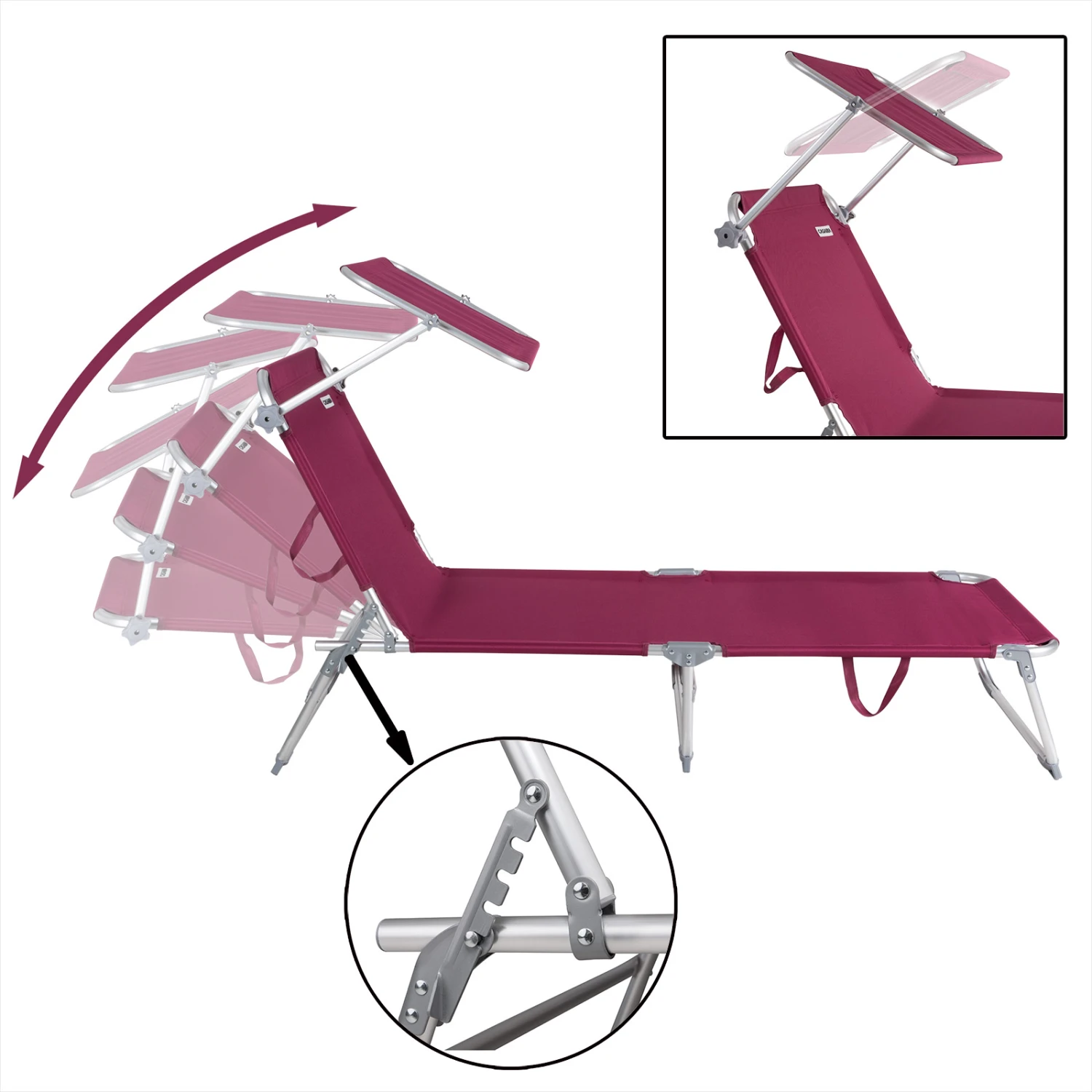 Das Sonnendach ist stufenlos verstellbar und die robusten Aluminiumgelenke sorgen für einen guten Stand. Die Bespannung der Liege ist mit 600D Polyester wetterfest und UV-beständig.