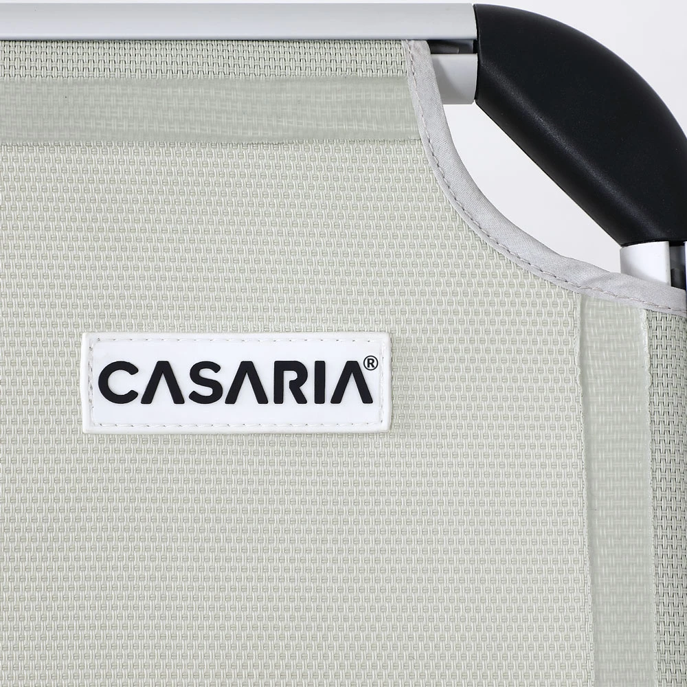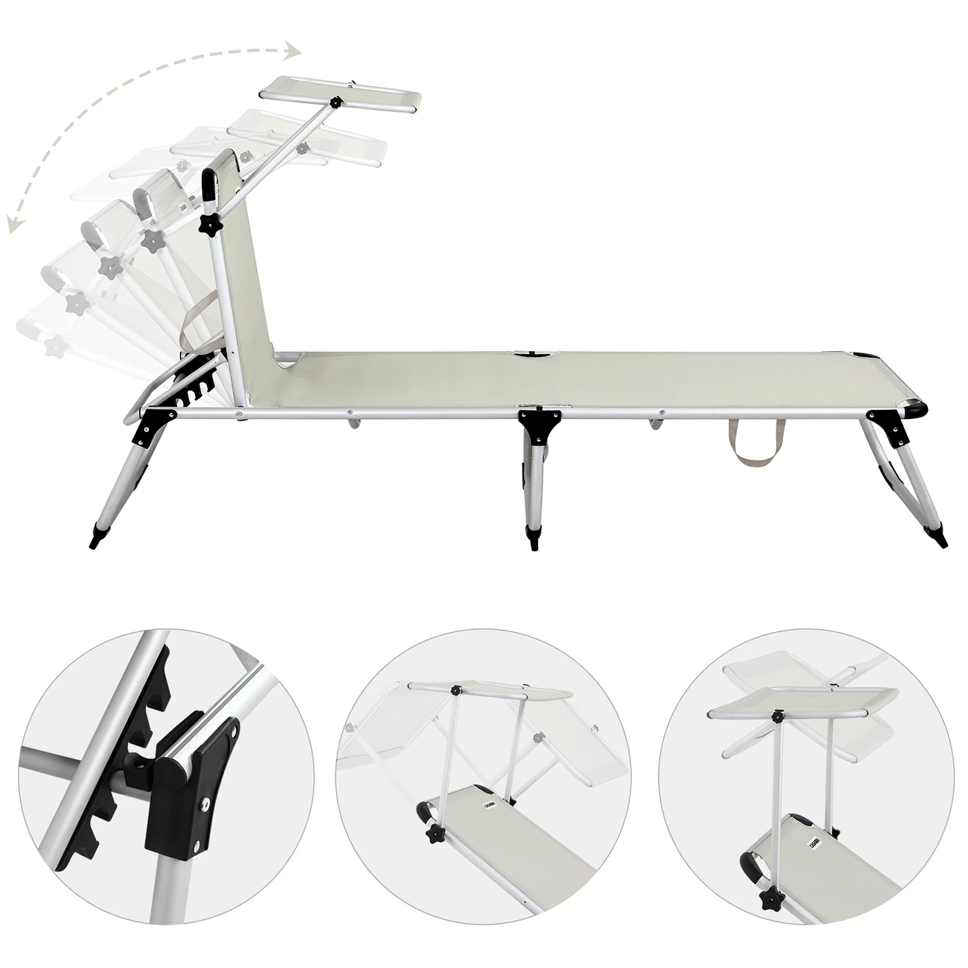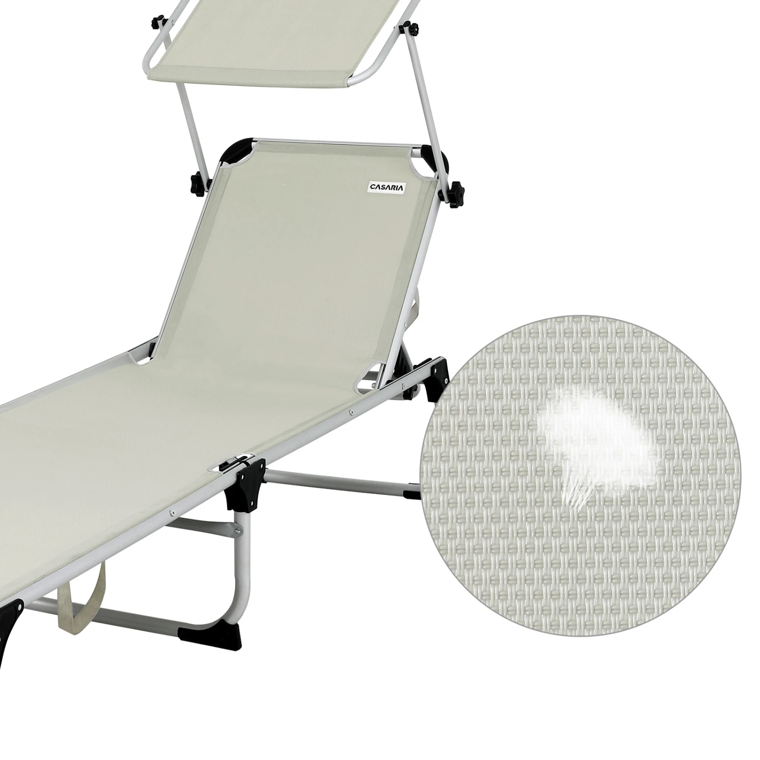 Das Sonnendach ist stufenlos verstellbar. Die robusten Metallgelenke sowie extra verstärkte Arretiergelenke sorgen für einen stabilen Stand. Die Bespannung der Liege ist durch den 2×2 Textilbezug wetterfest und UV-beständig.