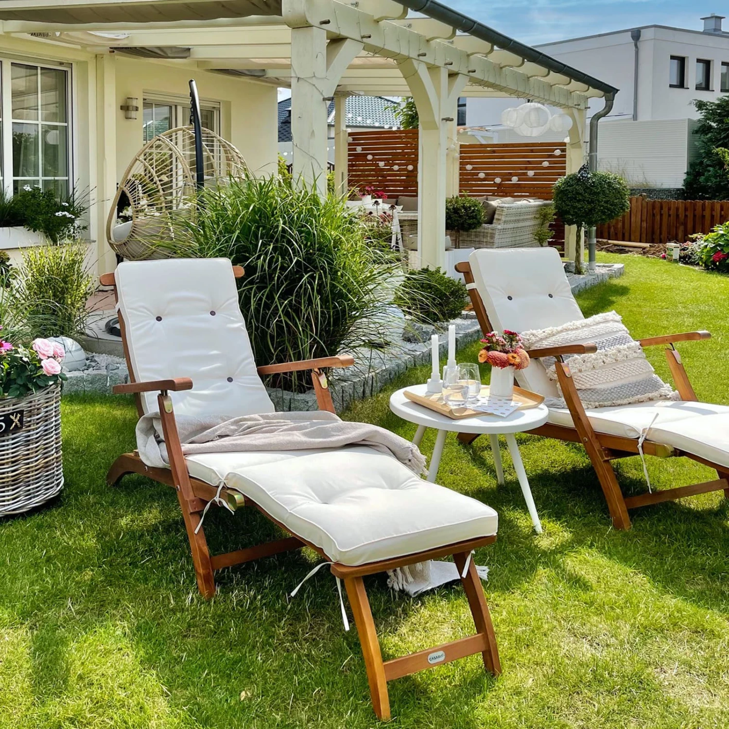 Die klappbare Sonnenliege aus Akazien-Holz mit bequemer Fußablage und verstellbarer Rückenlehne verwöhnt dich mit hohem Liegekomfort.