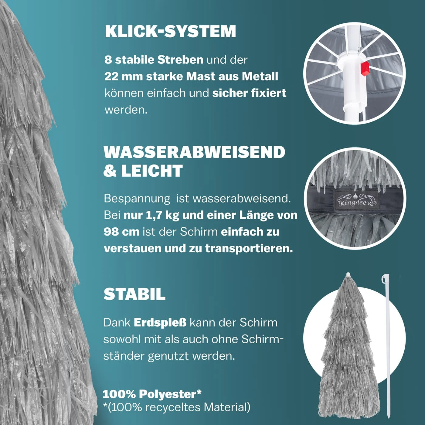 8 Streben und ein 22 mm starker Mast aus Metall sorgen für einen stabilen Stand. Aufgrund des geringen Gewichts von 1,7 kg und einer Länge von nur 98 cm (zusammengeklappt) lässt sich der Hawaiischirm leicht verstauen und transportieren.
