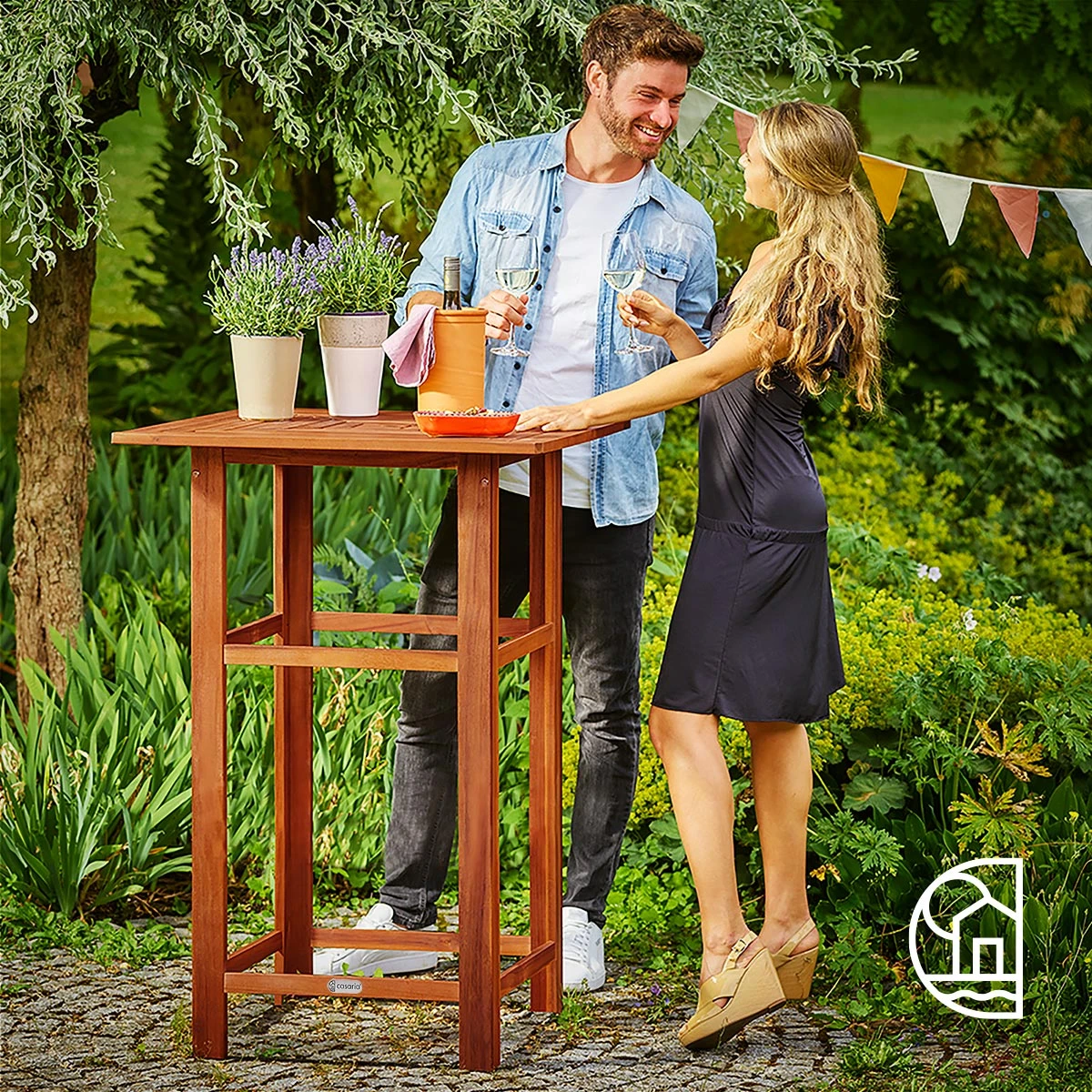 Der Stehtisch aus massivem Akazienholz hat eine quadratische 75 x 75 cm Tischplatte. Das Gestell besteht aus einer stabilen Vier-Fuß-Konstruktion.