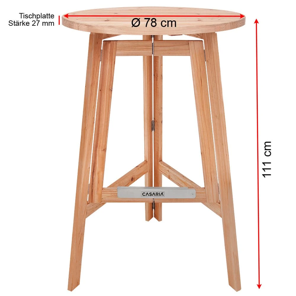 Der klappbare Stehtisch aus Massivholz hat eine runde Tischplatte mit 78 cm Durchmesser und 27 mm Stärke. Das Gestell ist eine Drei-Fuß-Konstruktion. Die Beine werden ineinander geklappt und die Tischplatte wird seitlich abgeklappt. Eine Metallschiene am Fußgestell sorgt zusätzlich für einen sicheren Stand.